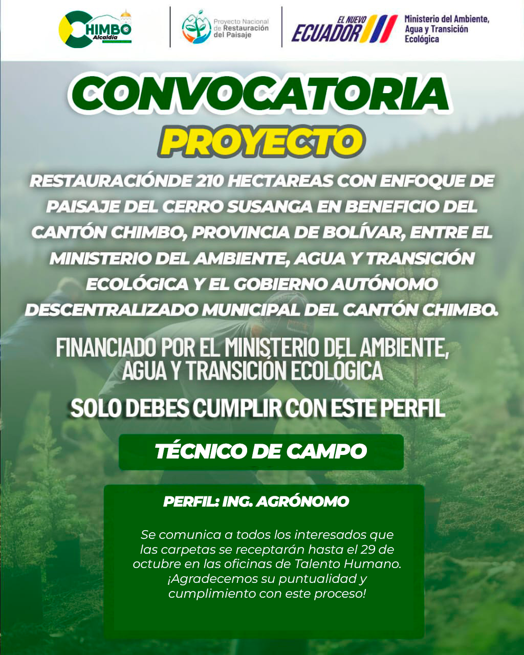 Súmate a la restauración de 210 hectáreas con enfoque de paisaje en el Cerro Susanga, en beneficio del cantón Chimbo, provincia de Bolívar, entre el Ministerio del Ambiente, Agua y Transición Ecológica y el Gobierno Autónomo Descentralizado del Cantón Chimbo.